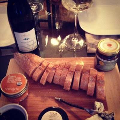 Like any good hostess I had a spread out when they arrived. Coach Farm, which is in Hudson Valley NY, has a delicious Fresh Goat Ricotta. It's a French twist on the classic Ricotta, having a taste similar to a fresh chevre. I also served a creamy Gorgonzola. I chose this one because it's creaminess softens the blue-cheese sharpness. Along side the cheese's I picked up a fresh baguette at the Local Le Pain Quotidian and some spreads; a white truffle acacia honey (which is out of this world), black olive tapanade, white fig fruit spread and a fresh basil pesto. I wanted a light, crisp white to go with the apps, so I decided on a Sauvignon Blanc. I got a bottle of "Fournier Sauvignon Vin De Pays Du Jardin De La France, 2010". It was delicious! It was clean and citrusy and went perfectly with the fresh ricotta and honey. I highly recommend picking up a bottle asap!